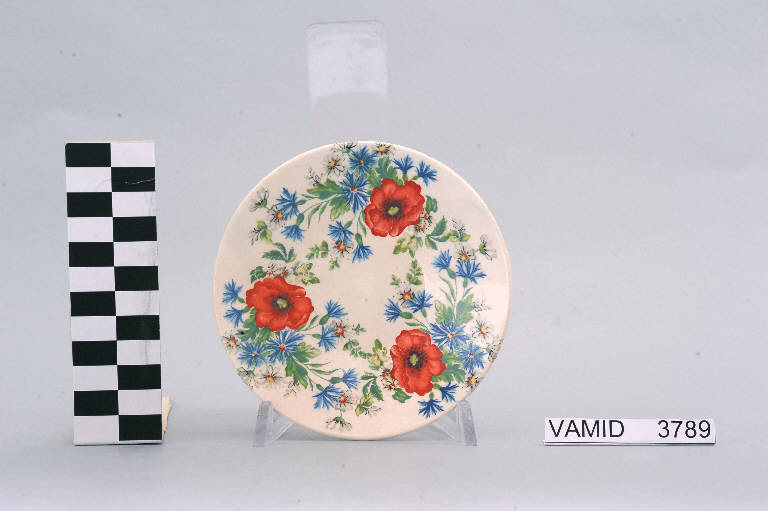 - NOTIZIE STORICO CRITICHE Il piattino in esame, appartenente ad un servizio da caffè (num inv. 3787...3805), presenta un motivo floreale di tipo tradizionale, costituito da bouquets di papaveri, violette e margherite disposti regolarmente, reso con morbidi effetti di chiaroscuro e con una policromia ricca e sfumata realizzata con la tecnica della decalcomania soprasmalto. La foggia del manufatto, utilizzata sia nelle manifatture italiane come la "S.C.I" che in quelle europee come la "Villeroy & Boch", confermerebbe la datazione al 1950-1960 ca. Nel Midec sono conservati un servizio da thè realizzato nella forma "C 205" progettata da Antonia Campi (num inv. 3781...3807) e un vasetto (num. inv. 3150) che presentano il medesimo motivo ornamentale. Il piattino fa parte di una donazione di privati al Museo.