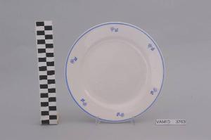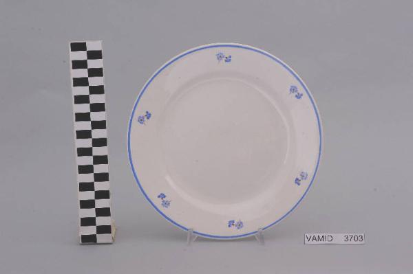 Piatto piano di forma circolare; fondo bianco decorato con piccoli mazzi di fiori disposti regolarmente lungo l'ala; bordo rifinito con filettatura blu.