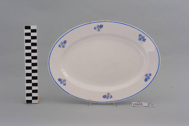 Piatto da portata di forma ovale; fondo bianco decorato con piccoli mazzi di fiori disposti regolarmente lungo l'ala; bordo rifinito con filettatura blu.