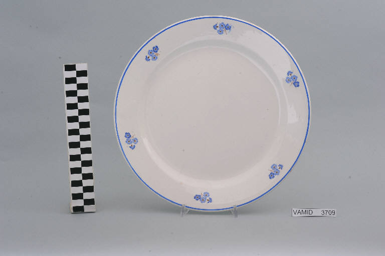 - NOTIZIE STORICO CRITICHE L'oggetto in esame, appartenente ad un servizio da tavola (num. inv. 3700-3709), rientra in una tipologia di vasellame di gusto corrente. La foggia ancora classica e un decoro piatto privo di effetti tridimensionali, che reinterpreta in chiave stilizzata e semplificata composizioni floreali di tipo tradizionale, indacano una datazione circoscrivibile agli anni '30 e '40 del Novecento. Si tratta di una tipologia di decoro, costituito da piccoli mazzi di fiori disposti regolarmente realizzati con la tecnica della decalcomania soprasmalto, utilizzato sia dalla Società Ceramica Revelli che dalla Richard Ginori. Il piatto fa parte di una donazione di privati al Museo (Bellotti Ferdinando, 2010).