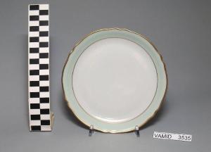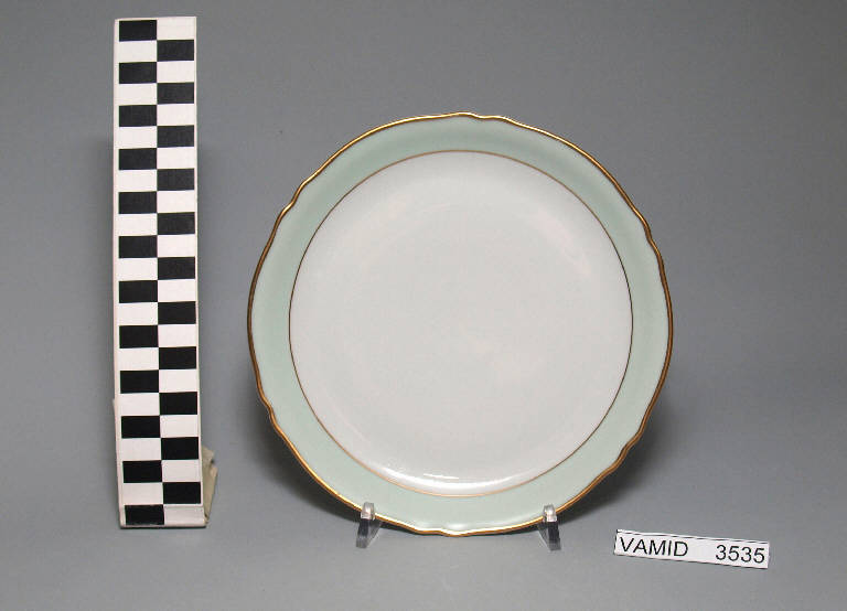 - NOTIZIE STORICO CRITICHE Il manufatto in esame, appartenente ad un servizio di piatti (num. inv. 3524-3535), rientra in una tipologia di vasellame di gusto corrente prodotto, a partire dagli anni '70, sia dalla Società Ceramica del Verbano che dalla della Richard Ginori. L'ala color verde acqua e la filettatura oro sono eseguiti soprasmalto. Il piatto fa parte di una donazione di privati al Museo.