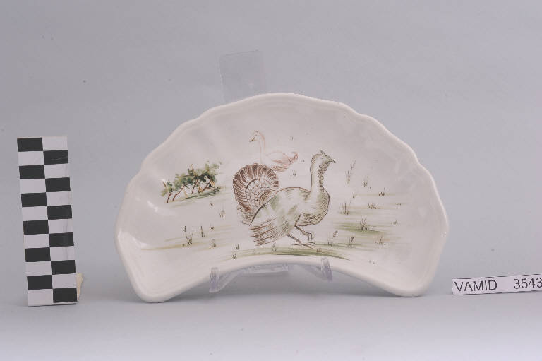 Piatto mezzaluna con orlo festonato; fondo color bianco avorio con animali policromi.