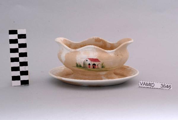 Salsiera fissata a piatto raccogligoccia ovale; contenitore con bombatura evidente e orlo ondulato con due beccucci sporgenti; fondo color bianco avorio con decoro policromo all'esterno.