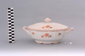 Zuppiera di forma ovale con manici rettangolari leggermente sagomati; coperchio ovale con presa apicale; fondo bianco decorato con motivo floreale policromo disposto all'esterno del recipiente e sul coperchio; manici, coperchio e piede della zuppiera rifiniti con filettatura rossa.