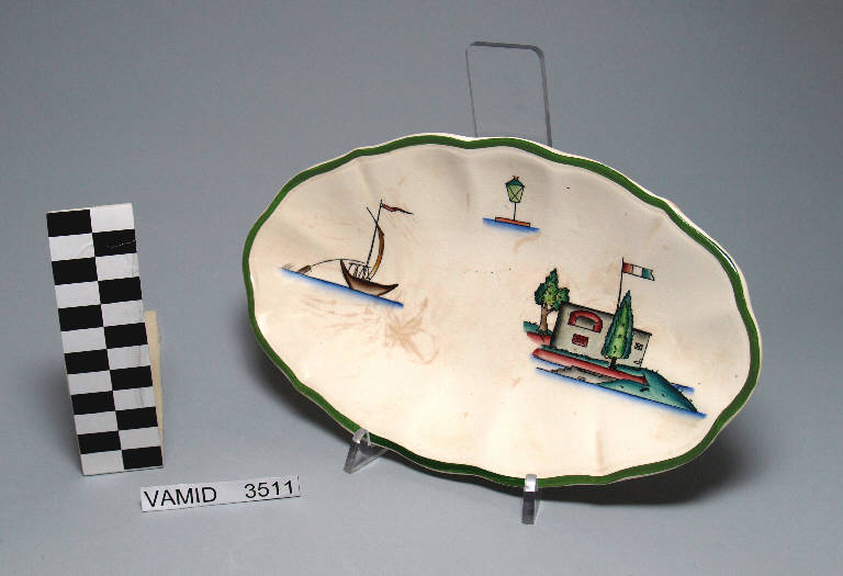 - NOTIZIE STORICO CRITICHE La raviera, in serie con altri piatti aventi decori diversi, fa parte di un servizio da tavola della forma "Vecchio Milano" con decoro "Lago Maggiore" n. 6641 (num. inv. 2051...3517). In questo esemplare sono raffigurati uno scorcio (un fortino con bandiera italiana sulla riva del lago) ed elementi caratteristici della vita sul lago (una boa luminosa e una barca da pesca tipica, detta burchiello, in navigazione) rappresentati in un'atmosfera sospesa e silenziosa, seppur ridente nella resa stilizzata e nel fresco cromatismo delle raffigurazioni. In terraglia forte il servizio "Vecchio Milano" venne prodotto dalla "S.C.I." a partire dal 1923. Il fatto che il decoro "Lago Maggiore" non sia riportato sul catalogo del 1926 induce a pensare che sia stato creato dall'Andlovitz dopo questa data. La sua ideazione, pertanto, viene a collocarsi molto probabilmente tra il 1926 e il 1927, cioè tra il catalogo aziendale e la nascita della nuova forma per la III Biennale di Monza. Nel 1931 l'Andlovitz, che fin dalla sua nomina a direttore artistico si prefisse di rigenerare le forme tradizionali con decori nuovi, adattò alla forma "Vecchio Milano" il nuovissimo decoro "Lago Maggiore", a conferma che una decorazione nuova, se concepita organicamente, può conferire un aspetto attuale e "scattante" anche a una bella forma tradizionale. Nell'ambito dei repertori decorativi creati dall'Andlovitz il decoro "Lago Maggiore" rappresenta un modo frazionato di raffigurare il paesaggio, definito da Mario Munari a "scena spezzata". L'impianto decorativo di queste ceramiche rifugge dalla centralità e dalle strutturazioni lungo direttrici ortogonali, mentre vi predominano l'asimmetria e le fughe visuali sghembe che risentono del gusto per la cineseria e il giapponismo. La semplificazione geometrica degli elementi e il modo di sfumare i corpi nel'intento di suggerirne la volumetria ricorda le opere di Carlo Carrà degli anni venti. Nel decoro "Lago Maggiore" sono presenti espressioni diversificate di un tema molto caro a Guido Andlovitz: i "paesaggi d'acqua" con particolare ricorrenza delle 'barche' raffigurate in una vasta gamma di tipi, generalmente riprese da modelli reali e con divertenti variazioni fantastiche. Il decoro "Lago" fu applicato in un primo momento sulla forma "Vecchio Milano", poi sulla forma "Pomezia" (1936 ca.). Di tale decoro esistono diversi disegni originali a matita, pastello, inchiostro e acquerello su carta conservati nel fondo archivistico della "S.C.I.": alcuni di questi raffigurano il decoro proprio sulla forma "Vecchio Milano" con le rifiniture che compaiono sui pezzi finiti. Nel Museo sono conservati anche un servizio da tavola (num. inv. 2667...2911) e un servizio da caffè (num. inv. 2672...2900) forma "Vecchio Milano" con decoro "Lago Maggiore" con filettaura policroma. Negli anni '90 la Richard Ginori ha rimesso in produzione il servizio "Lago". \nIl servizio in esame è eseguito a colaggio, mentre i decori sono realizzati a decalcomania e dipinti a mano: si vedano a tal proposito le lastre in rame acciaiato conservate nel Midec e raffiguranti molti dei decori presenti nel servizio in combinazioni diversificate (nn. inv. 2480, 2483, 2484, 2485).\nLa raviera fa parte di una donazione di privati al Museo (Bellorini e Porta, 2003).