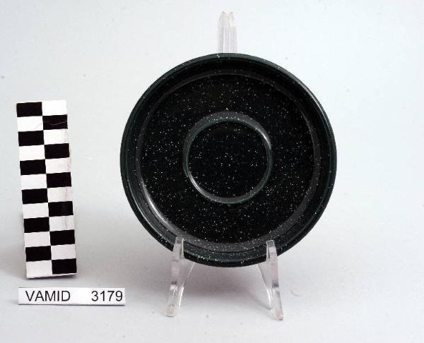 Piattino da tè di forma circolare con bordo rialzato; fondo verde scuro puntinato in bianco.