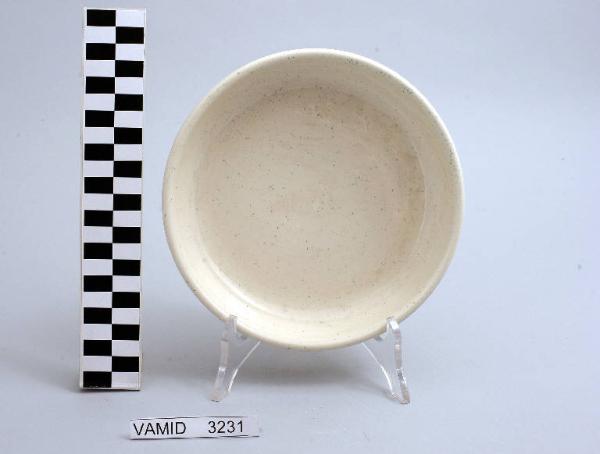 - NOTIZIE STORICO CRITICHE L'oggetto in esame, appartenente ad un servizio da tavola (num. inv. 3176...3232), si inserisce in un filone di stoviglie e vasellame di gusto corrente. Lo stile funzionale ed assolutamente essenziale indica una datazione all'interno della seconda metà del Novecento. Il marchio non identificato permette comunque di escludere una manifattura straniera. Tipologicamente si lega ad un servizio da thè (num. inv. 3174, 3179), a un servizio da colazione (num. inv. 3175, 3180) e e a un servizio da caffè (num. inv. 3178, 3234) conservati presso il Museo.\nLa presenza presso il Midec di un servizio da thè (num. inv. 3172...3229) e un servizio da tavola (num. inv. 3177...3233) prodotti, sempre in gres, dalle "Ceramiche Pareschi" dimostra come la foggia del servizio in esame sia una tipologia ampiamente in uso tra le varie manifatture. Il piatto fa parte di una donazione di privati.