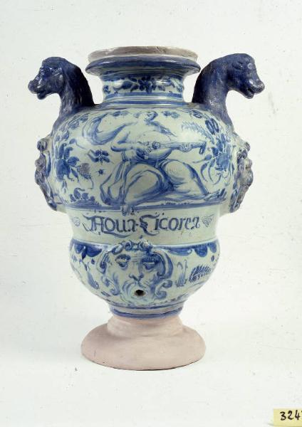 Vaso farmaceutico in magnolia lavorato al tornio. La morfologia è ricavata da uno schema ovoidale con una strozzatura a circa un terzo dell'altezza e raccordata nella parte superiore a un collo troncoconico con una cornice aggettata sotto la bocca estroflessa e stante su un piede svasato con base ad anello. \nDue anse a protomi leonine sono inserite sopra le spalle che hanno al di sotto due mascheroni. La decorazione "a scenografia barocca" raffigura due personaggi immersi tra piante e fiori: da un lato un personaggio femminile che suona il liuto, dall'altro un guerriero che è coricato a terra. \nNel lato del personaggio femminile è presente il grande cartiglio che porta l'inserzione farmaceutica "Aqua Cicorea", mentre nel lato del guerriero arrivano solo le grandi plicature della parte terminale del cartiglio. L'intera decorazione è caratterizzata e accomunata da una monocromia blu cobalto su fondo azzurrino.