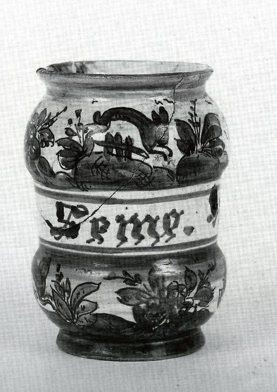 - NOTIZIE STORICO CRITICHE L'opera riprende le forme dei celebri vasi e manufatti impiegati in campo farmaceutico. Proviene da Albisola dove durante gli inizi del XX secolo molte fornaci cominciarono a riprodurre le antiche maioliche dai colori azzurri (Cameirana 1966, pp. 285-289; Cameirana 1974, pp. 110-180; Cameirana 2002, p. 120). La paternità rimane incerta.