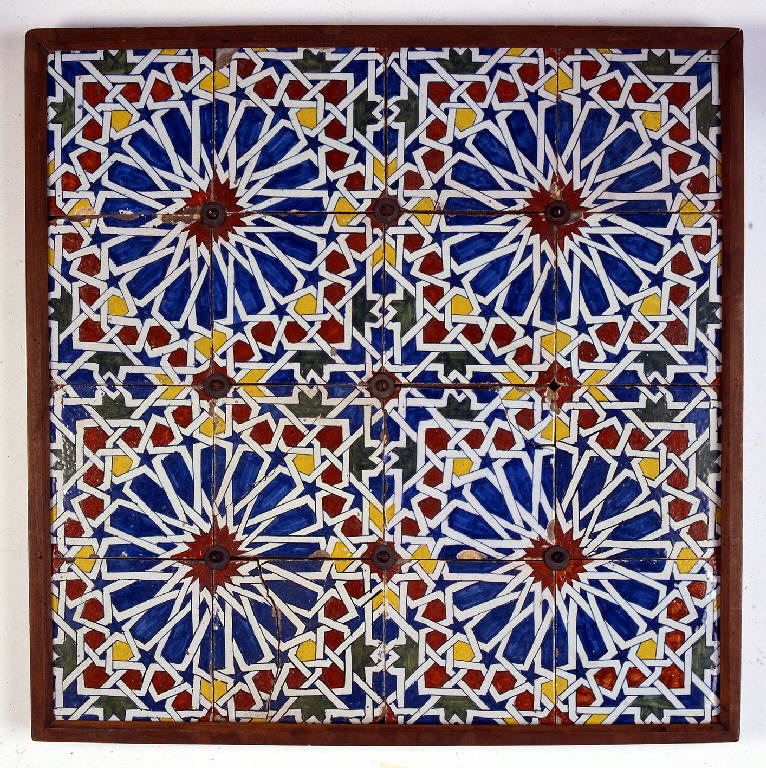 - NOTIZIE STORICO CRITICHE Le piastrelle provengono dalla produzione manifatturiera di Albisola e risalgono alla prima metà del XX secolo quando nella città ligure molte fornaci producevano imitazioni delle antiche maioliche (Cameirana 1966, pp. 285-289; Cameirana 1974, pp. 110-180; Cameirana 2002, p. 120).\nIl motivo decorativo ripreso rimanda a influenze varie: da un esemplare del XII secolo esposto nel Museo d'Arte Islamica del Cairo (Humbert, Denizot, 1980, p. 126, Cameirana 2002, p. 124); dagli azulejos ispa-porto-moreschi; da un decoro che era a Palazzo Pavesi (Savona), e ora è esposto nella Pinacoteca Civica della stessa città (Aiolfi, Buscaglia 1990, p. 39; Cameirana 2002, p. 125).