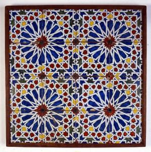 Il pannello, inserito in una cornice di legno, è formato da sedici piastrelle quadrate. La decorazione seriale è ripetuta per moduli di quattro piastrelle. La decorazione geometrica a nastri bianchi intrecciati dà vita a un motivo stellare a sedici punte. L'alternarsi dei nastri bianchi con le vivaci cromie blu, verdi e gialle all'interno dei campi di risulta, crea un sinuoso e continuo movimento.