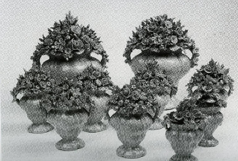 Serie di vasetti a balaustro in terraglia monocroma bianca di varie misure. Il corpo vasale è foggiato a stampo mentre le decorazioni superiori sono realizzate a mano. La parte inferiore si collega, mediante un rigonfiamento del corpo vasale, al piede strombato quadrilobo mentre la parte superiore è movimentata da nervature e termina con un breve collo che precede la bocca estroflessa. Dalla spalla si dipartono le due anse interamente ricoperte da fiori.\nLa decorazione superiore è formata da mazzi di roselline, piccoli fiori e foglie disposti secondo uno schema piramidale.
