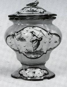 I due vasetti a balaustro hanno base quadrilobata su piede strombato da cui si sviluppa un corpo rigonfio movimentato da costolature, breve collo estroflesso col labbro arrotondato e dal profilo mosso che si ripete sull'orlo del coperchio.\nIl coperchio è ripartito da lievi nervature e termina con una presa a forma di frutto. \nIl corpo è caratterizzato da un rivestimento in smalto giallo mentre le profilature degli orli sono di color marrone. \nLe decorazioni sono contenute in due ampli scudi centrali e in due minori posti sulla base e sul coperchio. Le scene rappresentate sono appena accennate: una figura con ombrello, uccelli e piccoli animali all'interno di una minuta vegetazione: il tutto con cromie marroni.