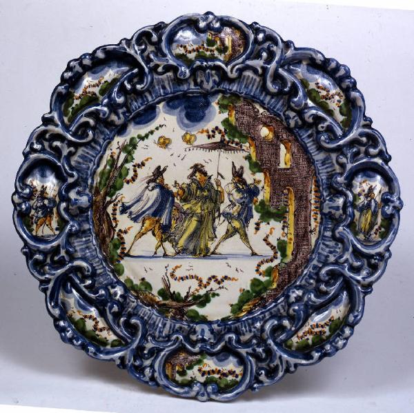 Grande piatto tondo, foggiato al tornio, in terracotta smaltata caratterizzato da una decorazione in monocromia marrone ritmata da tocchi di bianco su fondo grigio. L'orlatura del piatto è profilata di grigio e con base ad anello. Il soggetto occupa intera la superficie in una raffigurazione tradizionale: San Giorgio, protettore della città di Genova, è issato sul cavallo impennato mentre è pronto a infliggere, con la sciabola stretta nella mano destra, il colpo letale al dragone che sta ai suoi piedi e occupa la parte sinistra inferiore della scena. A fianco del drago vi è una lancia spezzata, mentre nello sfondo piante e rocce completano la scena. San Giorgio è raffigurato con grande eleganza: il cavallo ha ricchi finimenti e il santo indossa una raffinata armatura con elmo piumato.