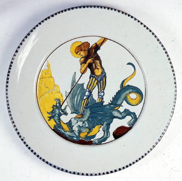 Piatto tondo, foggiato al tornio, con larga tesa obliqua, bordo filettato in azzurro e profilato da perlinatura bruna, ampio cavetto e piede ad anello. La parte centrale del piatto è occupata dalla figura di San Giorgio, protettore della città di Genova, che è raffigurato con l'armatura nell'atto tradizionale di trafiggere con la lancia il drago sconfitto e disteso ai suoi piedi. Alle sue spalle un'alta montagna la cui vetta è occupata da un castello con campanile.