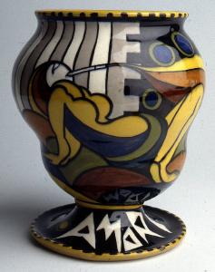 Vaso rigonfio a balaustra con morfologia irregolare, collo corto e bocca larga dal bordo estroflesso e base leggermente svasata, che poggia su piede circolare. Decorato con colori e smalti sottovernice in un'audace policromia ha da un lato del piede la scritta a lettere cubitali "AMORI" e dall'altro "FIORI". In corrispondenza con le scritte i soggetti rappresentati: una donna semisvestita per il primo lato, colta nell'atto di fumare da un lungo bocchino da cui si dipartono voluttuose e azzurre nubi di fumo, dall'altro un vaso di fiori con due rose fiorite.