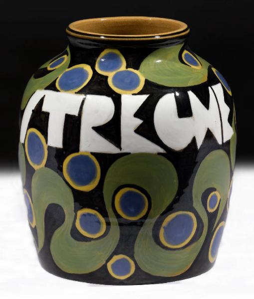 Il vaso, foggiato al tornio, ha un corpo leggermente asimmetrico e rigonfio che poggia su una larga base e termina in un collo corto con bocca larga dal bordo appena estroflesso. La cromia di base nera è stata applicata direttamente al biscotto, mentre successiva è la scritta a caratteri cubitali bianchi "STREGHE" contornata da motivo a serpentina ondeggiante verde acido nelle cui anse troviamo bolli azzurri profilati di giallo. \nDall'altro lato il profilo di una vecchia strega triste, realizzato con forme geometriche dalle diverse cromie: giallo per il naso adunco, verde per il mento aguzzo e grigio per la bocca a forma di cerniera.