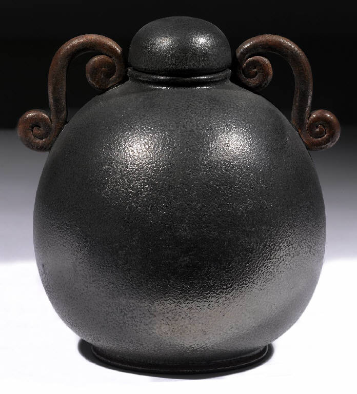 Piccolo orcio globulare, in terracotta smaltata a riflesso metallico semimat, su base circolare con coperchio a calotta e anello di sicurezza, e con una stretta bocca definita dall'orlo profilato ad anello. L'orcio si completa con due manici ad ansa in guisa di "s" che si dipartono dall'orlo per saldarsi alti sulla spalla.\nLa monocromia è ottenuta con una sovrapposizione di smalti di diverso colore: nero e metallizzato salvia nel corpo; prugna e grigio-verde nelle anse; grigio-verde nell'interno. La superficie è caratterizzata da un effetto a buccia di arancia.