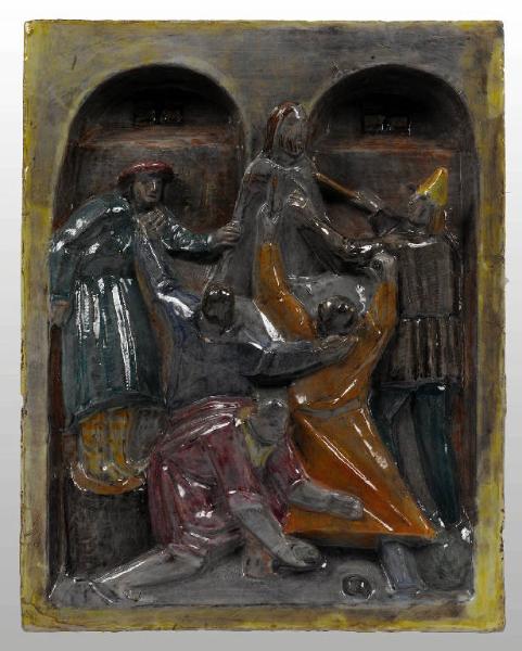 - NOTIZIE STORICO CRITICHE La formella fu acquistata alla "Terza Mostra Internazionale delle Arti Decorative" di Monza nel 1927.\nL'opera è parte di un ciclo di sei formelle dalla "Via Crucis" che furono commissionate dall'architetto genovese Mario Labò (1884-1961) all'artista Arturo Martini (1889 - 1947) al termine del precedente lavoro il "Presepio grande", ultimato tra il 1926 e il 1927. \nLa formella appartiene alla produzione di maioliche di Arturo Martini che vide proprio nella terracotta la possibilità di modernizzare l'arte scultorea, collaborando, alla fine degli anni Venti, con Manlio Trucco, decoratore di questa formella, e fondatore della casa La Fenice.