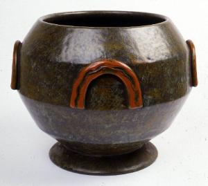 Il portavaso a forma globulare, lavorato al tornio, è in terracotta rivestita di smalto semimat. Esso poggia su un piede espanso e ha la superficie divisa da quattro strisce anulari orizzontali dai profili netti. La parte centrale è caratterizzata da quattro anse arancioni semicircolari solcate al centro da una serpentina bruna incisa, che rimanda alla monocromia opaca verde scuro dell'intero corpo.