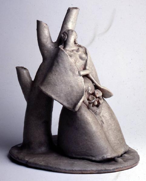 La scultura, in terracotta smaltata mat craquelé, è impostata su una base circolare. L'opera raffigura una giovane donna languidamente appoggiata a un tronco con le spalle e la schiena e con il capo inclinato a sua volta all'indietro verso il tronco. La donna ha un lungo collo, tratti somatici appena delineati e un gravido ventre; essa è abbigliata con un abito lungo che ricade dritto fino ai piedi mentre il capo è a sua volta coperto da uno scialle fissato sul davanti da una spilla; ella stringe tra le mani, al di sotto del ventre, un mazzo di fiori. \nLa gonna e lo scialle sono costruiti come due coni sovrapposti.