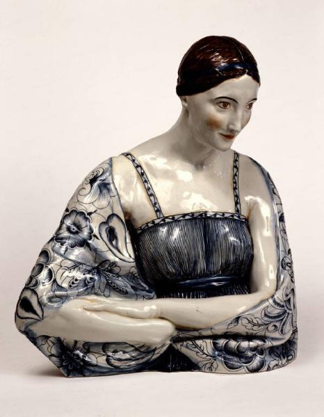 Busto di elegante donna in terraglia. La giovane donna indossa un corsetto a sottili righe azzurre sostenuto da spalline con fine decoro e stretto sotto il seno da un nastro. Un amplio scialle, con fantasia a grandi fiori turchini disegnato su fondo bianco, poggia sulla spalla destra e copre in parte il braccio destro, mentre l'avambraccio sinistro è libero e incrocia il destro. Il volto della donna è appena rivolto verso sinistra e reclinato verso il basso. I capelli castani sono divisi in due bande laterali, separati da una scriminatura centrale, e sono poi raccolti nella parte posteriore in uno chignon trattenuto da un nastro azzurro.