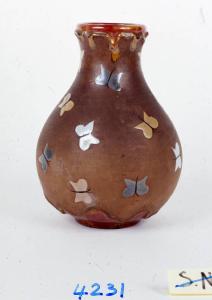 Piccolo vaso piriforme con breve collo, labbro rigonfio e arrotondato, e con base ad anello. L'interno, la bocca e la base sono interamente rivestiti da uno smalto bordeaux con colature (sangue di bue), mentre la parte esterna del vaso è rivestita da uno strato opaco bruno chiaro, creando un sapiente contrasto tra elementi lucidi e opachi. La decorazione è ultimata con l'applicazione di farfalle stilizzate dal corpo nero e dalle ali lucenti in smalti monocromi beige, bianchi e blu.