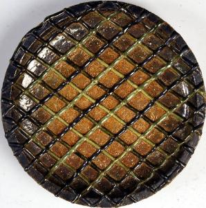 Alzata su piede basso ad anello e con parete spessa. Il piano superiore, leggermente cavo, è caratterizzato da un decoro plastico ottenuto mediante regolari e sottili cordoni a rilievo in monocromie che variano dal verde pisello al bruno. Il corpo ceramico è invece color arachide, mentre l'anello d'appoggio è smaltato in blu aviazione.