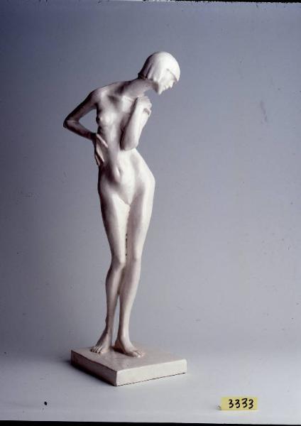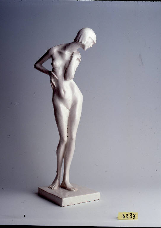 La scultura in maiolica raffigura una giovane donna nuda colta in una posa rilassata. La scultura ha una posa composta che accentua la sinuosità del corpo: le ginocchia unite, il lungo collo che sporge fortemente sulla sinistra e con il volto rivolto verso il basso. La donna ha la mano destra posata sul fianco e crea così un triangolo, la mano sinistra invece poggia sulla spalla in una posa molto privata e riflessiva e nasconde con il braccio il seno.\nL'opera è interamente smaltata di bianco e poggia su una base quadrata.