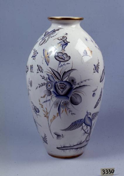 Il vaso ha un corpo ovoidale con spalla rigonfia, corto collo cilindrico, piccola bocca e orlo arrotondato estroflesso profilato d'oro. Esso poggia su di una base a fondo piatto leggermente incavato anch'esso profilato d'oro. L'intero vaso è ricoperto da una vernice trasparente ed è decorato con policromie grigio, blu e oro. La decorazione è caratterizzata da due principali grandi mazzi di fiori recisi su cui danza una figura che suona il flauto. Nella parte inferiore vi sono piccoli isolotti abitati da architetture e fenici con ali spiegate. Altri elementi decorativi sono sparsi sulla superficie: fruttini, farfalle, e piccoli mazzi di foglie.