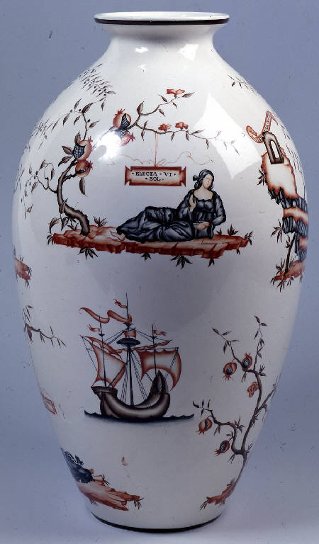 Il vaso ha un corpo ovoidale con spalla rigonfia, corto collo cilindrico, piccola bocca e orlo arrotondato estroflesso profilato d'oro. Esso poggia su di una base a fondo piatto leggermente incavato anch'esso profilato d'oro. \nLa decorazione pittorica è costituita da quattro diverse scene: tre isole e uno scenario marino con un veliero a tre alberi. La prima isola è a gradoni con un sinuoso tronco di olivo e un padiglione con porta spalancata su cui vi è il cartiglio "Insula noctis". La seconda isola ha invece una figura femminile dormiente con un grande albero di melograno da cui pende un cartello con la dicitura "speculom sine macula". L'ultima isola ha anch'essa una figura femminile seduta con gambe allungate e busto eretto accanto a un albero di melograno su cui troviamo il cartello con la scritta "pulchra ut luna". \nTre cartigli accompagnano infine i gruppi figurati; "praeclara ut fons"; "electa ut sol"; "Insula diei similis a insulae noctis". Essi rimandano alle figure della bellezza citate nei testi biblici (R. Ausenda 2002, p. 156).