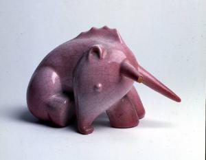 Piccola scultura a tutto tondo in terracotta aranciata e rivestita da smalto bianco colorato in rosa a spruzzo. L'opera raffigura un animale fantastico macrocefalo con corta cresta sul dorso e due lunghe corna. L'animale è seduto sulle gambe posteriori e poggia con l'estremità del muso a terra. L'intero corpo è coperto da una fitta maglia craquelé.