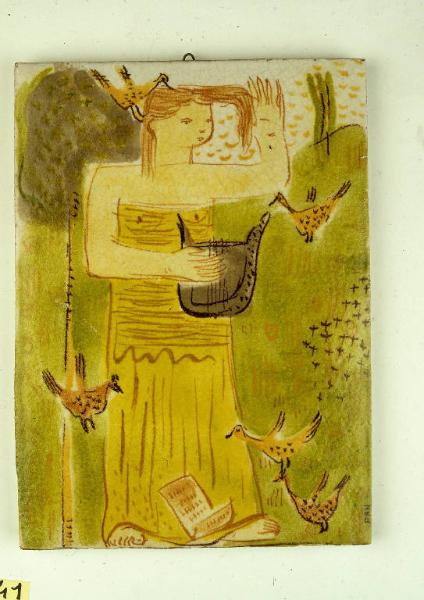 Pannello rettangolare in terracotta smaltata. La scena raffigura una figura femminile rivolta verso destra, che regge nella mano destra una cetra, mentre il braccio sinistro è alzato a formare un angolo di novanta gradi. La donna indossa una veste a panneggi color giallo che cade sino ai piedi dove si trova un foglio fittamente scritto. Il paesaggio, erboso con un grande albero sulla sinistra è arricchito dalla presenza di cinque uccelli stilizzati.
