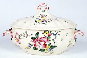 Zuppiera, in terracotta color camoscio rivestita in smalto bianco, con un corpo costituito da una vasca esalobata che poggia su una base piana, con due grandi prese laterali formate da tre elementi a rocaille che sporgono dalla parete. Il coperchio, a doppia calotta rigonfia, termina con una presa superiore ad anello.\nL'intero pezzo è decorato da fiori contornati, in particolare il corpo centrale è occupato da una rosa stilizzata disegnata con un tratto nero e con petali dipinti in una sola pennellata rosa magenta sfumata ed è accompagnata da fiori secondari gialli e azzurri.