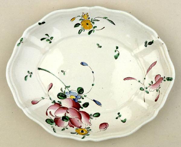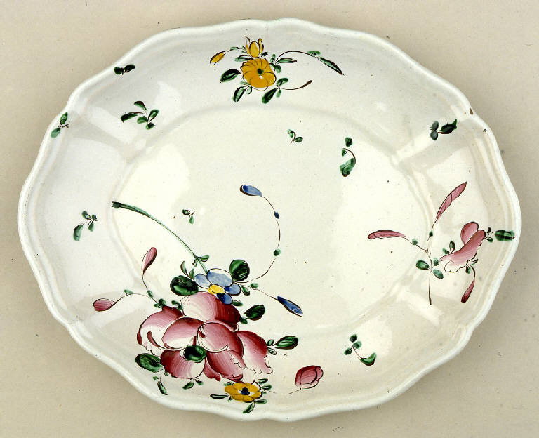La serie di piatti, in terracotta color camoscio rivestita in smalto bianco, è costituita da un piatto tondo (inv. 2407) e da tre piatti ovali (inv. 1228, 702, 703). I piatti, a stampo, hanno una struttura tra loro simile: orlo octolobato sottolineato da una cordonatura; costolature lungo la tesa; balza mossa.\nLa decorazione è caratterizzata da elementi floreali, in particolare la parte centrale dei piatti è occupato da una grande rosa di color rosa, disegnata con rapide pennellate, e accompagnata da fiori minori.