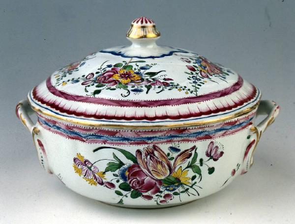 Tazza da brodo con corpo esalobato e coperchio a calotta ribassata, colletto rocaille a leggero rilievo e presa superiore a pomello. Lungo i lati sono presenti due anse a rocaille a doppia "C" affrontata. Il piatto che accompagna la tazza ha profilo esalobato e non ha una base d'appoggio.\nLa decorazione a piccolo fuoco è molto ricca: alle composizioni floreali si accompagnano elementi decorativi che profilano sia il piatto sia la tazza. Protagonista della decorazione è un grande mazzo con una rosa scura accompagnata da corolle da cui si dipartono steli con fiori secondari e foglie filiformi, mentre gli orli e il gioco plastico delle anse sono rilevati in oro.