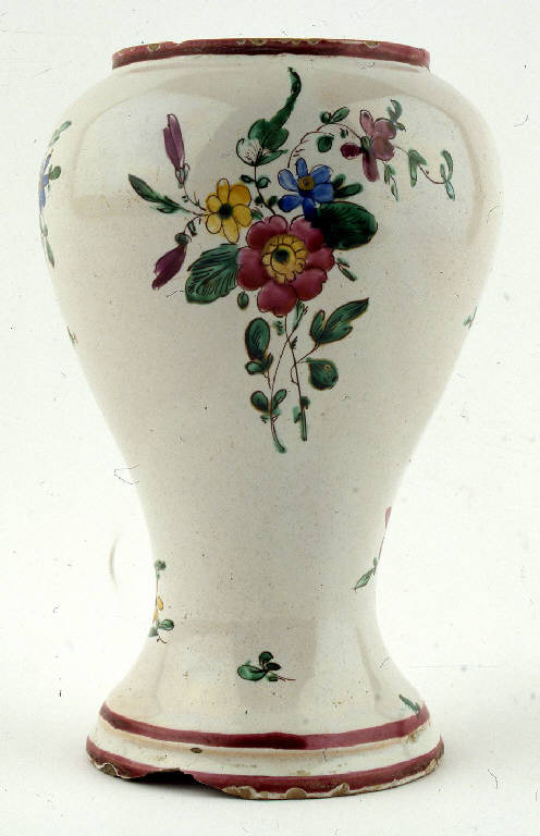 Vaso a balaustro con piede fortemente svasato e collo corto ad anello cilindrico. Sia il collo che il piede sono profilati con filetti in rosa magenta scuro, mentre la parte più rigonfia del vaso sono presenti due piccole composizioni floreali. I fiori hanno una policromia articolata su due toni di porpora, un blu e un giallo uovo. A completare la decorazione piccoli fiori sparsi e semis verdi sono sparsi sul corpo del vaso.