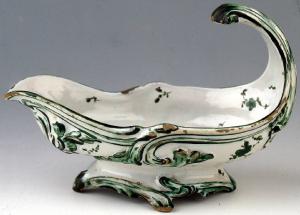 Salsiere gemelle in maiolica con forma a navicella e parete mossa da numerose rocaille di cui una, salendo a virgola, va a formarne la presa stessa. La decorazione è costituita da linee che sottolineano il movimento a rilievo delle salsiere, mentre nella parte frontale, sotto il becco, è presente un piccolo fiore. All'interno è invece dipinta una grande rosa con stelo spinoso accompagnata da fiori secondari che sono sparsi sulla superficie. La decorazione è in cromia verde e nera, mentre l'orlo è profilato in bruno scuro.