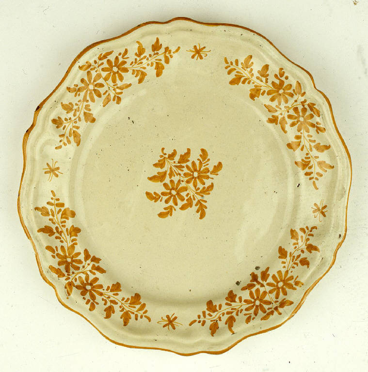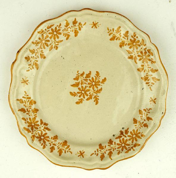 Piatto esalobato con orlo rigonfio, tesa inclinata costolata, balza liscia e fondo piatto, privo dell'appoggio ad anello. Il piatto è decorato nel centro del fondo da un piccolo mazzo floreale composto da due piccoli fiori e sottili fili fogliati, mentre lungo la tesa vi sono quattro raggruppamenti floreali che hanno al centro medesimi fiori stilizzati. L'orlo del piatto è profilato esternamente. \nLa decorazione è in monocromia gialla di antimonio dalla tonalità senape.