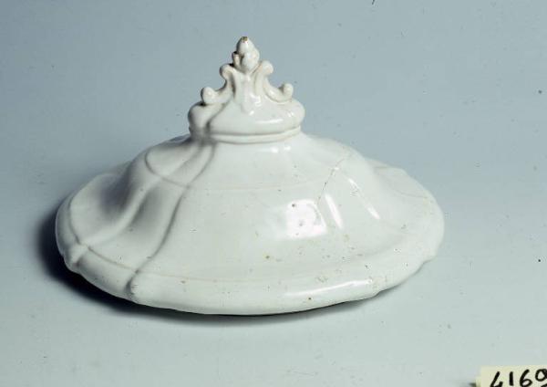 Coperchio di zuppiera in maiolica bianca dalla forma ovale e con profilo mosso. Il corpo è caratterizzato da una parete costolata, cuspidata terminante in una presa superiore a cresta dominata da un bocciolo.