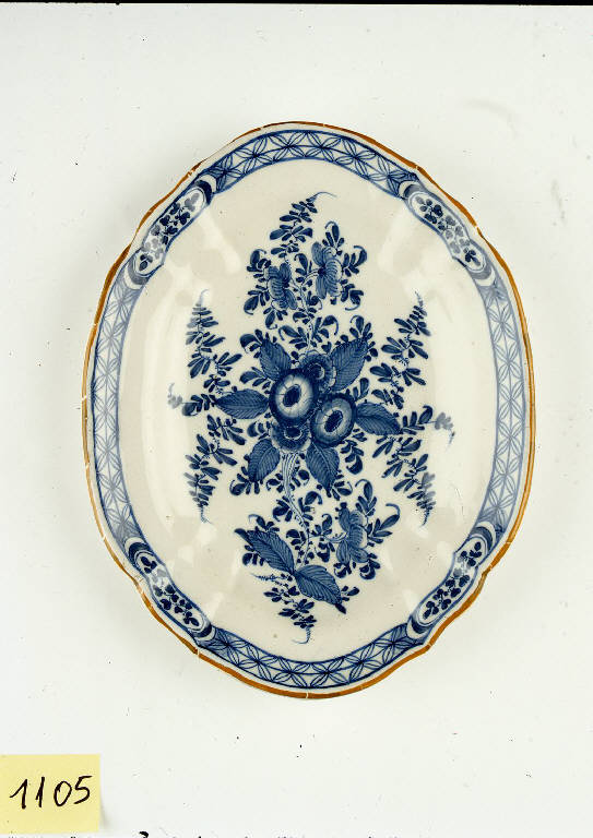 Piatto ovale in maiolica con leggera costolatura a raggiera che attraversa la tesa e privo dell'anello d'appoggio. L'orlo, profilato in color caffè, è mistilineo e va a formare quattro punte. Lungo la tesa è presente una bordura con motivo a losanghe interrotto da riserve abitate da fili fogliari in monocromia blu di cobalto. Il fondo è invece occupato da un motivo floreale composto da quattro margherite stilizzate circondate da un gioco a raggiera di foglie.
