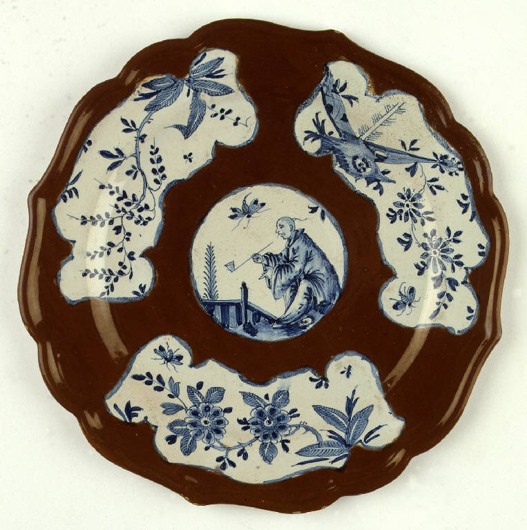 Piatto con fondo dall'orlo esalobato privo di anello d'appoggio. La superficie è rivestita in vernice bruna a parte quattro riserve che presentano su fondo bianco delle decorazioni in monocromia di cobalto. Al centro vi è una riserva tonda, mentre lungo la tesa vi sono tre riserve a fisarmonica. Le decorazioni sono di stile orientale: al centro una figura cinese di profilo è seduta e fuma da una lunga pipa; nelle riserve laterali vi sono elementi floreali e naturali stilizzati.