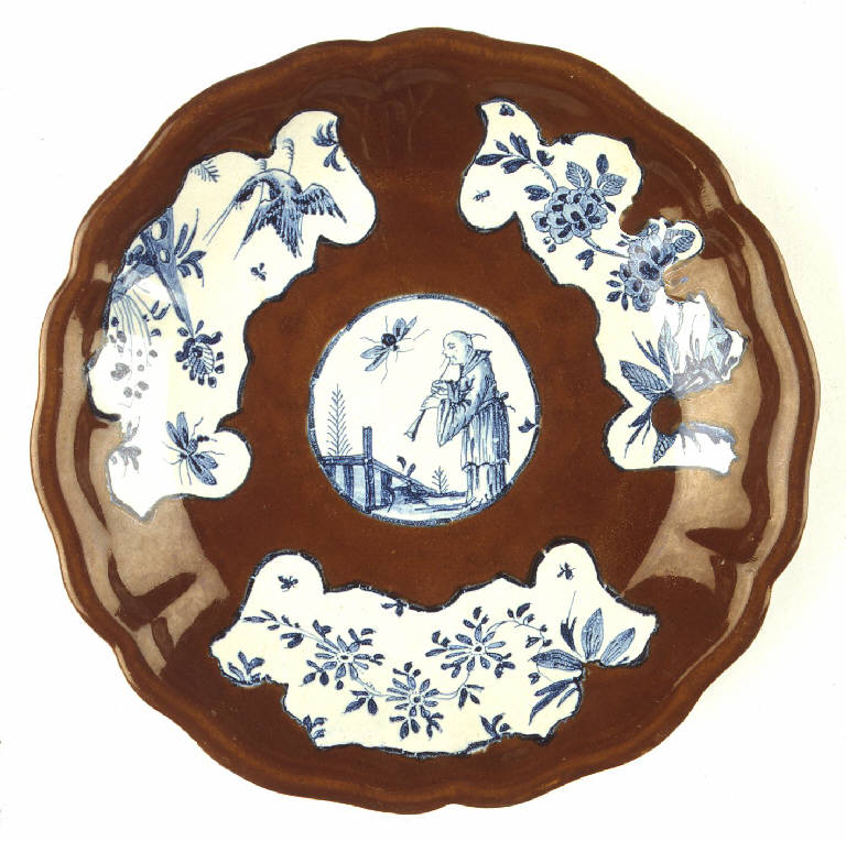 Piatto con fondo dall'orlo esalobato privo di anello d'appoggio. La superficie è rivestita in vernice bruna a parte quattro riserve che presentano su fondo bianco delle decorazioni in monocromia di cobalto. Al centro vi è una riserva tonda mentre lungo la tesa vi sono tre riserve a fisarmonica. Le decorazioni sono di stile orientale: al centro una figura cinese di profilo suona un lungo flauto; nelle riserve laterali vi sono elementi floreali e naturali stilizzati accompagnati, nel caso di quella di sinistra, da una fenice in volo.