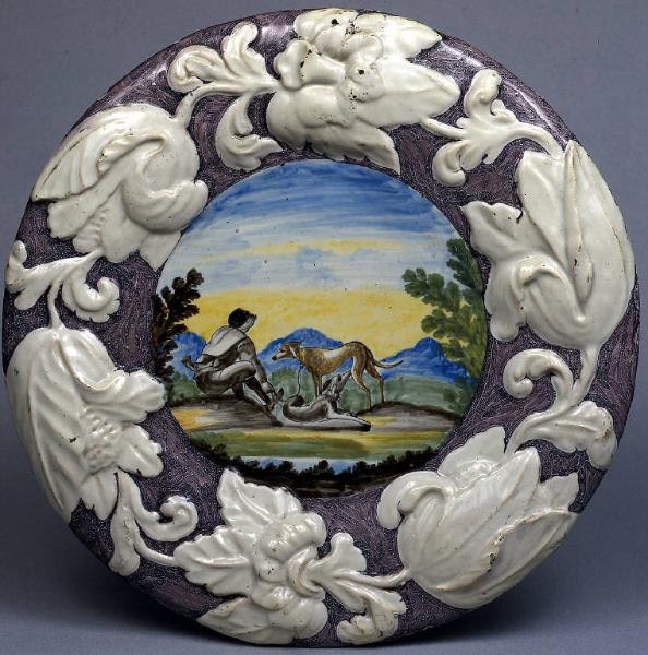 Grande piatto in smalto bianco, con cavetto poco distinto, larga tesa a rilievo con bordo ripiegato verso il basso e base apoda convessa. \nNel cavetto: al centro, in posizione preminente, un cacciatore accovacciato con due cani al guinzaglio; ai lati, quinte di piante nascenti dal perimetro; sullo sfondo un paesaggio montuoso. Nella tesa: un tralcio a rilievo con sei grandi fiori in smalto bianco su sfondo campito a manganese. All'esterno, sono disposte in cerchio, lungo l'intera superficie, quattro grandi piantine in blu.