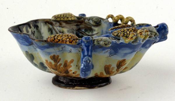 Tazza d'inganno ellittica con parete costolata, bordo lobato, manici ricurvi e piede ellittico. \nLungo il bordo è applicato un fischietto cilindrico, affiancato da due grappoli d'uva, foglie e viticci. La parete sotto il fischietto è doppia, con una serie di fori verso l'esterno. All'interno una decorazione "a scenografia barocca", mostra una figura che danza e suona tra quinte di piante nascenti dal bordo, in uno sfondo di monti blu e uccellini stilizzati. La decorazione policroma prosegue anche all'esterno dove sono presenti: dei cespugli, alcune velature in blu indicanti il cielo, e uccellini schematici sparsi. Le anse sono campite in blu, il piede è in manganese.