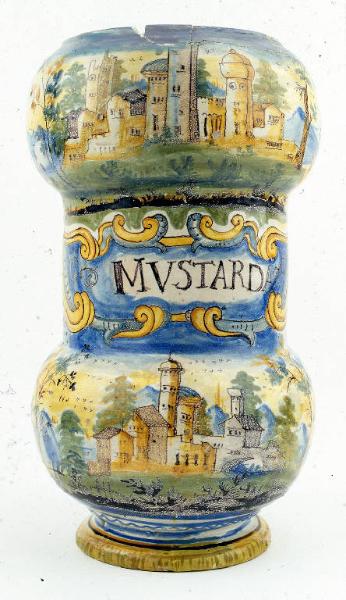 Grande albarello in smalto bianco con corpo a rocchetto, bocca larga con bordo lievemente pronunciato e piede distinto a disco. \nLa decorazione dell'albarello appare bipartita. Il lato frontale ha la parte mediana cilindrica occupata da una cornice a cartocci con l'inscrizione in lettere capitali "MVSTARDA", circondata da una campitura irregolare in blu; mentre i due rigonfiamenti alle estremità mostrano paesaggi simili, di edifici turriti tra quinte di piante, su uno sfondo di monti blu e uccellini schematici in volo. Il lato posteriore ha, invece, una decorazione uniforme senza suddivisioni, con un paesaggio scenografico di rovine in colonnato, su uno sfondo di edifici e torri.