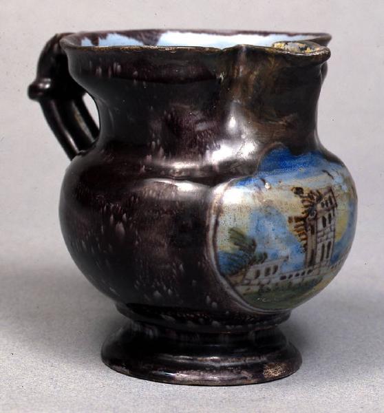 Boccale in foggiatura a tornio con ventre sferico, spalla marcata, ampia bocca trilobata, manico ricurvo binato con terminazione inferiore a serpentine divaricate e piede distinto in modanato. Nella zona frontale, un medaglione decorato al cui centro si trova una trilogia di edifici turriti "a castelletto" e una serie di uccelletti schematici; sullo sfondo un paesaggio montuoso di colore blu; in primo piano, lungo il perimetro, dei cespugli. Il resto del boccale è campito in manganese con smalto azzurro-grigio.