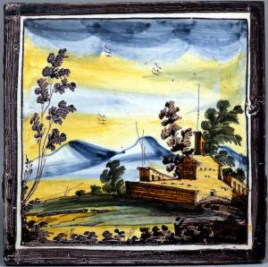 - NOTIZIE STORICO CRITICHE Le piastrelle, di provenienza ignota, sono da far risalire alla produzione ceramica pavese o lodigiana, della prima metà del XVIII secolo. Esse presentano maggiori affinità con le maioliche a paesaggi scenografici assegnabili alla produzione pavese, rispetto a quelle prodotte nel lodigiano o in altri centri padani ma, per quanto riguarda questa trilogia, l'attribuzione resta, tuttora, incerta.