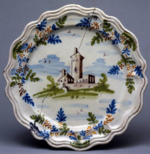 Piatto con tesa a orlo mistilineo e modanato.\nAl centro un gruppo di edifici turriti sorge da un'isola di terra con piante; lo sfondo è attraversato da velature che rappresentano il cielo; tutt'intorno, uccelletti schematici in volo. Lungo la cornice: rametti fogliati escono dal perimetro, mentre, in alto, pendono gruppi di nuvole "a goccia".