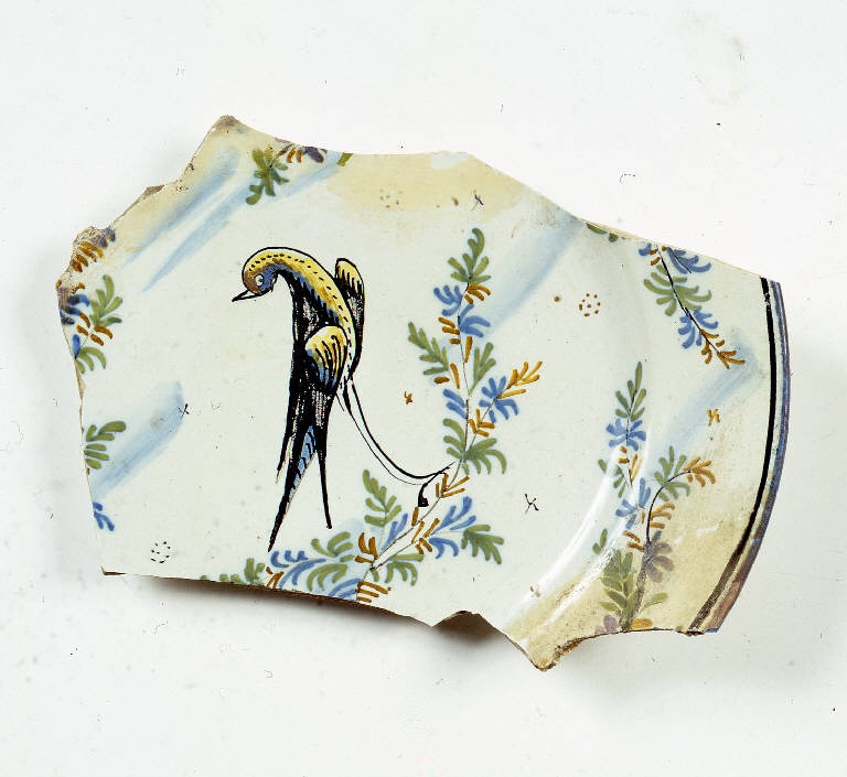 Frammento di piatto in smalto bianco a tesa obliqua e piede ad anello. \nL'apparato decorativo mostra tre diversi motivi: al centro, un uccello, probabilmente una rondine, appoggiata su di un ramo; lungo la cornice, resti di rametti fogliari nascenti dai bordi; infine, sullo sfondo, alcune velature azzurre accennano a delle nuvole a cirri. L'esterno del frammento è privo di decorazioni e marca.